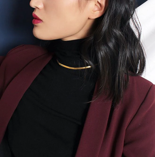 The Desi herringbone choker / necklace features a flat snake chain that shimmers beautifully at every turn. It fastens with a lobster clasp.