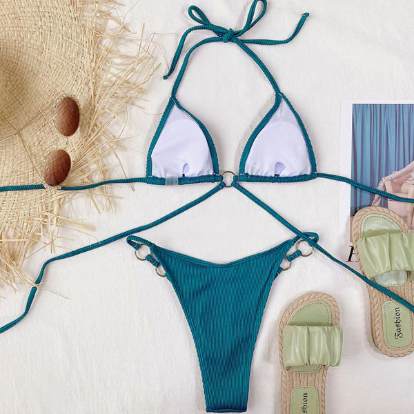 Catch everyone's eye while you catch some rays in the Yuri Ribbed Style String Bikini Set! This cute bikini has a ribbed knit construction with tying straps at the neck and back; allow for a custom fit and minimal tan lines. Matching bottom completes this beach perfect outfit!